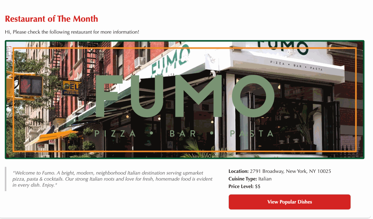 On the homepage, we highlight a featured restaurant of the month, displaying photos, a short description, and basic details. This section provides users with a starting point for exploring the restaurant.