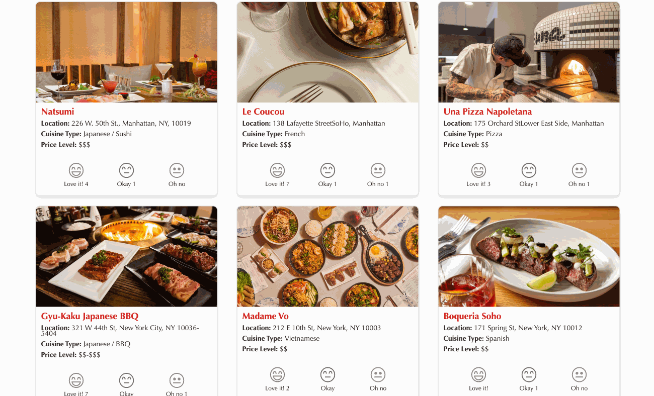 As someone who loves exploring New York City's dining spots, I often find myself juggling multiple sources - Eater's lists, Yelp reviews, and Google Maps - and end up having to rethink my choices. Popular reviews are much more intuitive and persuasive for me. I wanted a more straightforward, personalized way to discover great restaurants-something that combined the expert curation with real-time, user-driven feedback. That’s why we created "An Eater’s Collection of NYC":