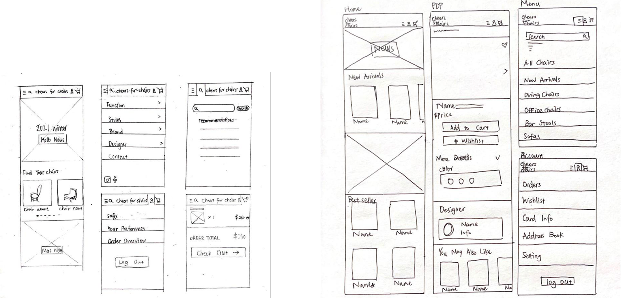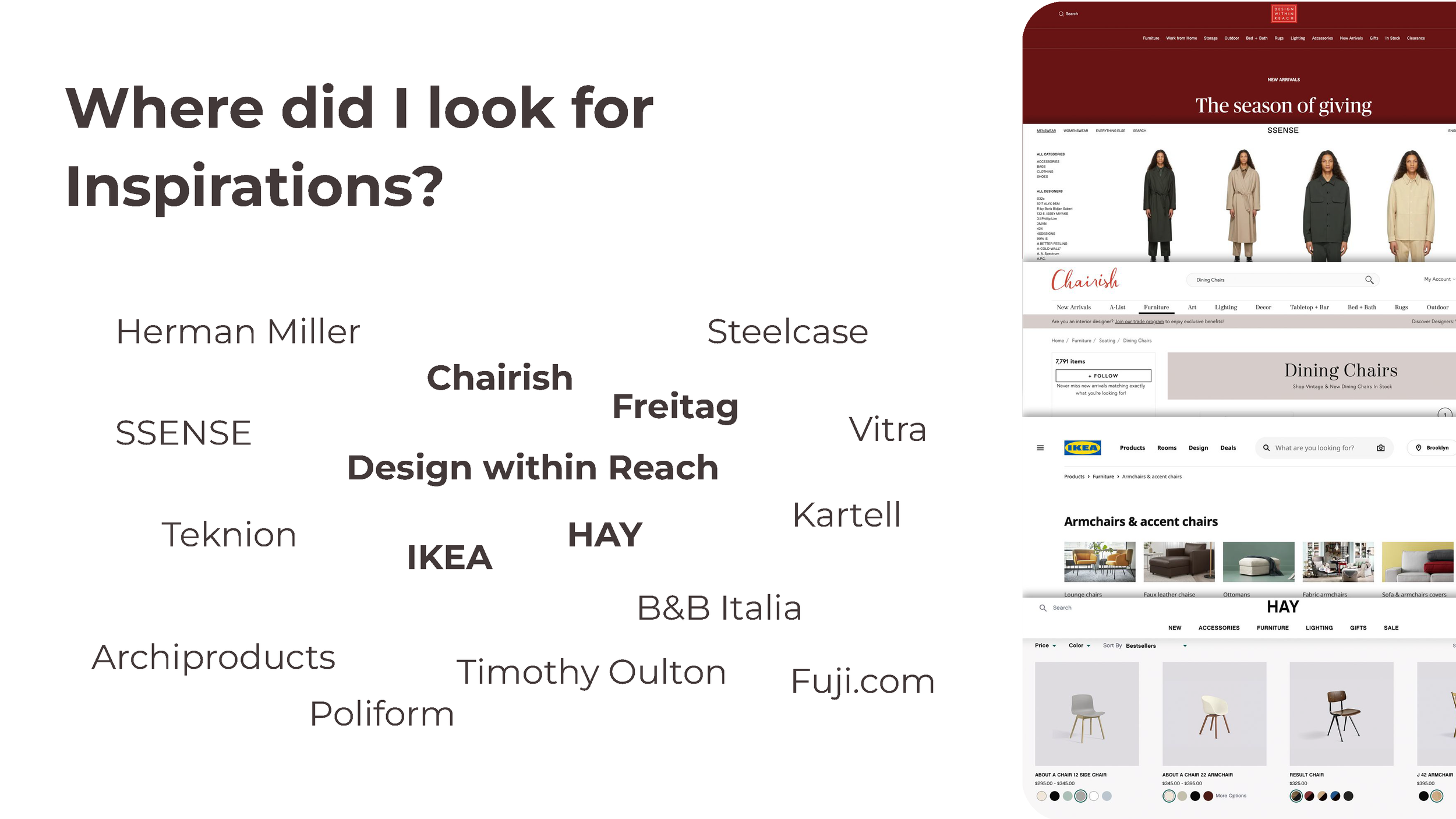 To refine the vision, I researched brands like Herman Miller, IKEA, and HAY, studying how they present their products online. Sites like Design Within Reach(DWR) and Chairish helped me understand how high-end furniture e-commerce works, from clean layouts to seamless user flows. These insights shaped the foundation of Cheers for Chairs, ensuring an experience that feels as refined as the products themselves.